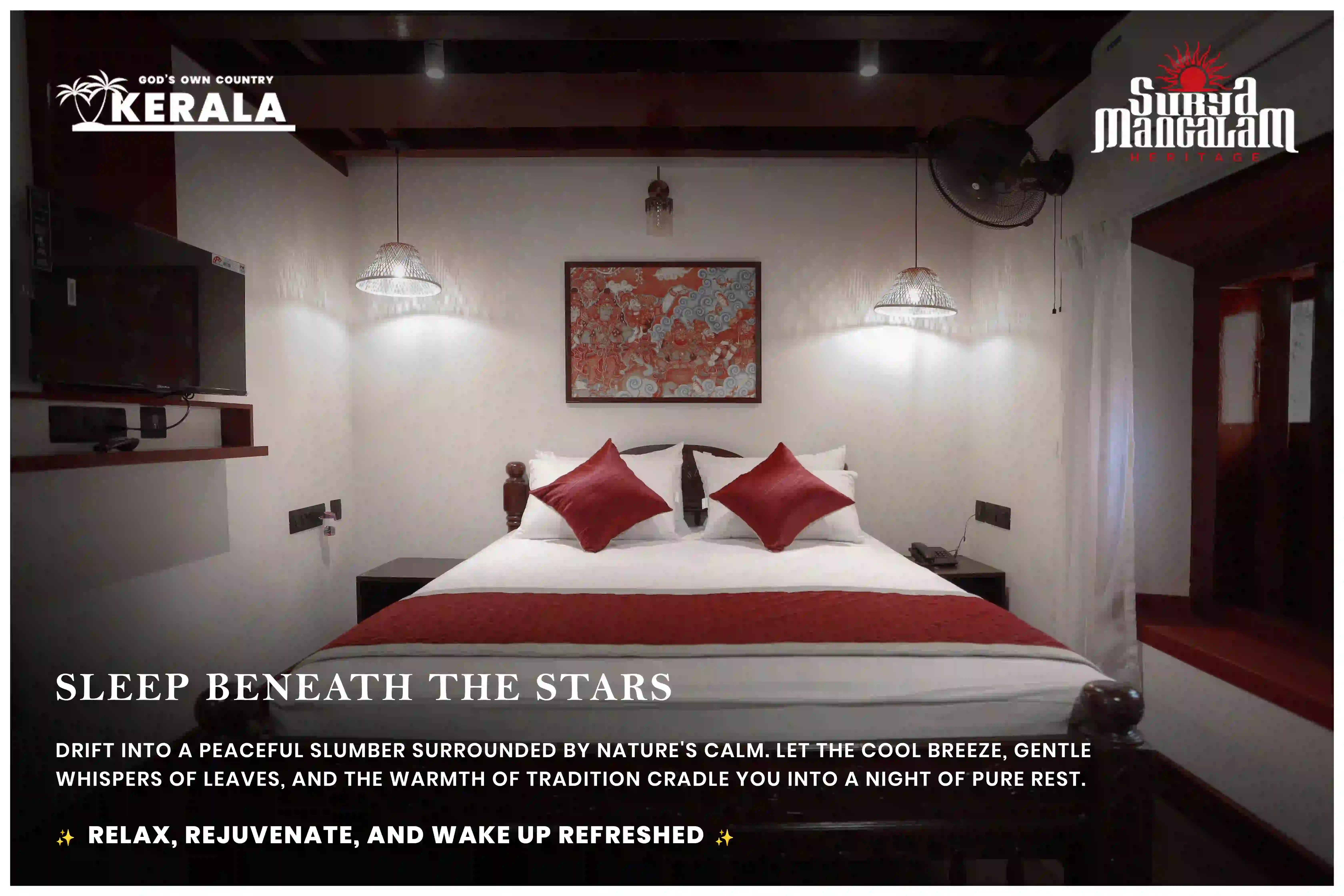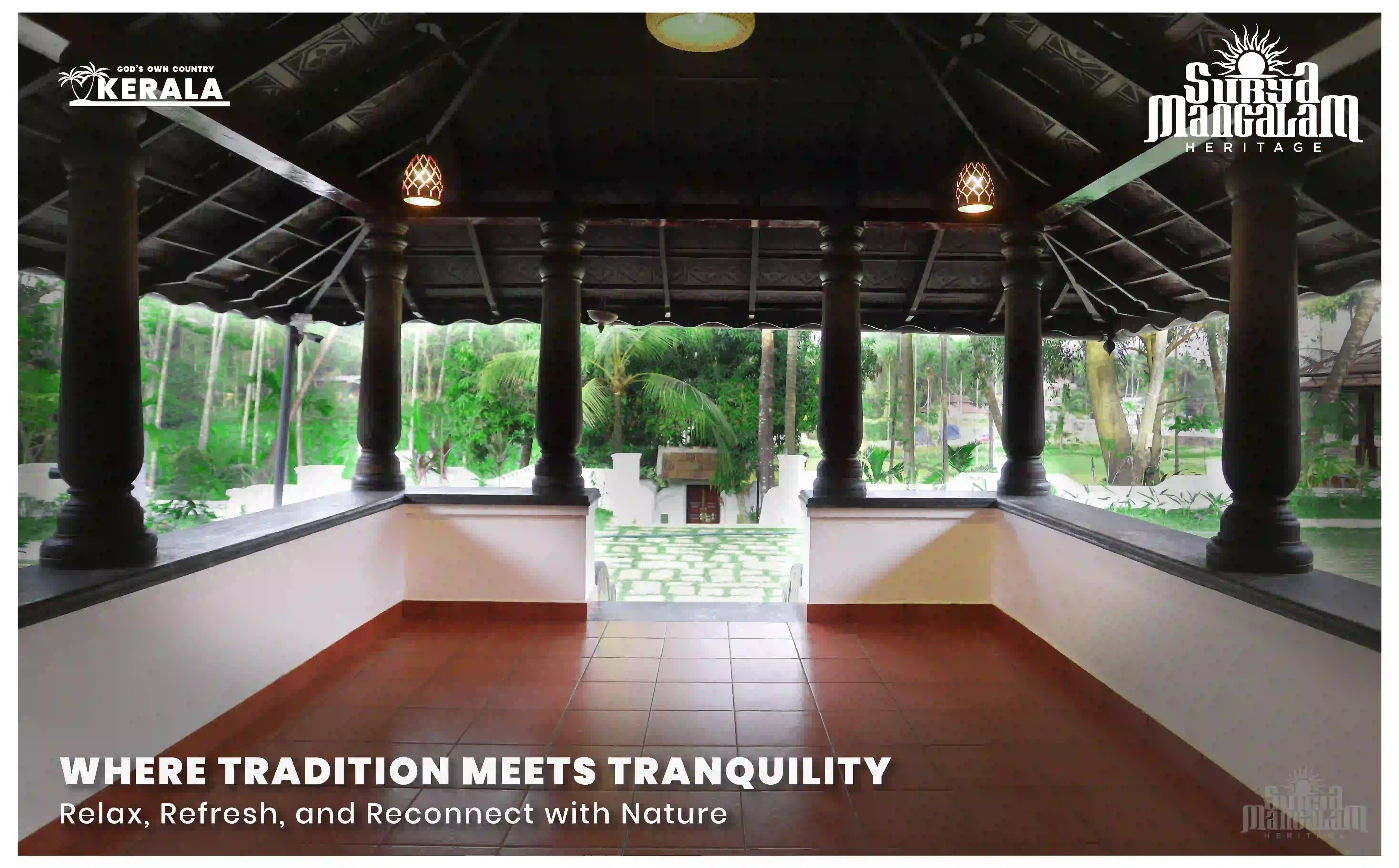 Reborn in luxury, Surya Mangalam Heritage was formerly known as "Koyamangalath House", originally constructed in 1840. Preserving its original charm and historical significance, it has been thoughtfully transformed into a modern heritage resort with premium facilities. Nestled in the picturesque landscape of Ottapalam in Kerala's Palakkad district, the resort offers all the comforts of a luxury getaway while remaining true to its rich cultural roots.